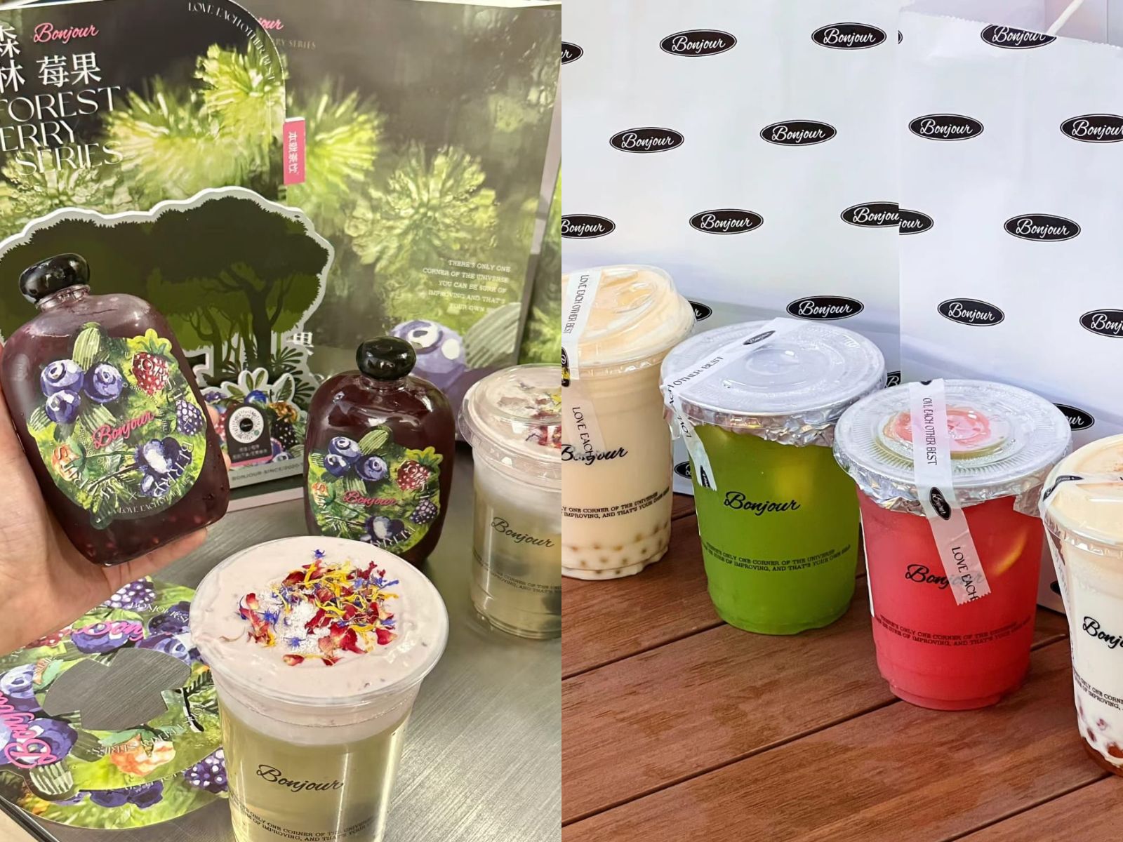 Bonjour的走紅在於成功打造了自身的特質。在產品上,Bonjour避開了奶茶品牌紛紛內捲的「茶底」,而主打「無茶底牛乳」,將「香濃」、「濃鬱」作為自己產品的特色。同時,除奶茶、美式外,門市也販售滋養鮮燉產品,透過桃膠、燕窩、雪燕等高價值食材提升產品整體的價值感。