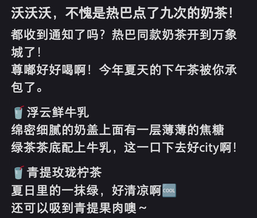 今年年初,女明星迪麗熱巴在上海參加活動時,曾讓工作人員去購買過幾杯該品牌的奶茶,引發粉絲瘋狂下單。從此,在小紅書、大眾點評上,品牌還有著「迪麗熱巴同款」、「迪麗熱巴嚴選」的標籤。