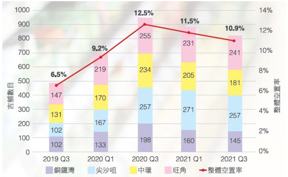陳浩璋續指,在飲食業帶動下,加上疫苗接種計畫展開、政府派發消費券,以及本地經濟復甦帶動下,整體街舖空置率下跌。不過,旺角區空置率逆市由年初的6.6%微升至最新6.9%,最新錄得241間吉舖,主要因為該區錄得多間短租店(尤其賀年用品店)結業,而且該區的飲食業商戶淨增長數目也較其他區為低。